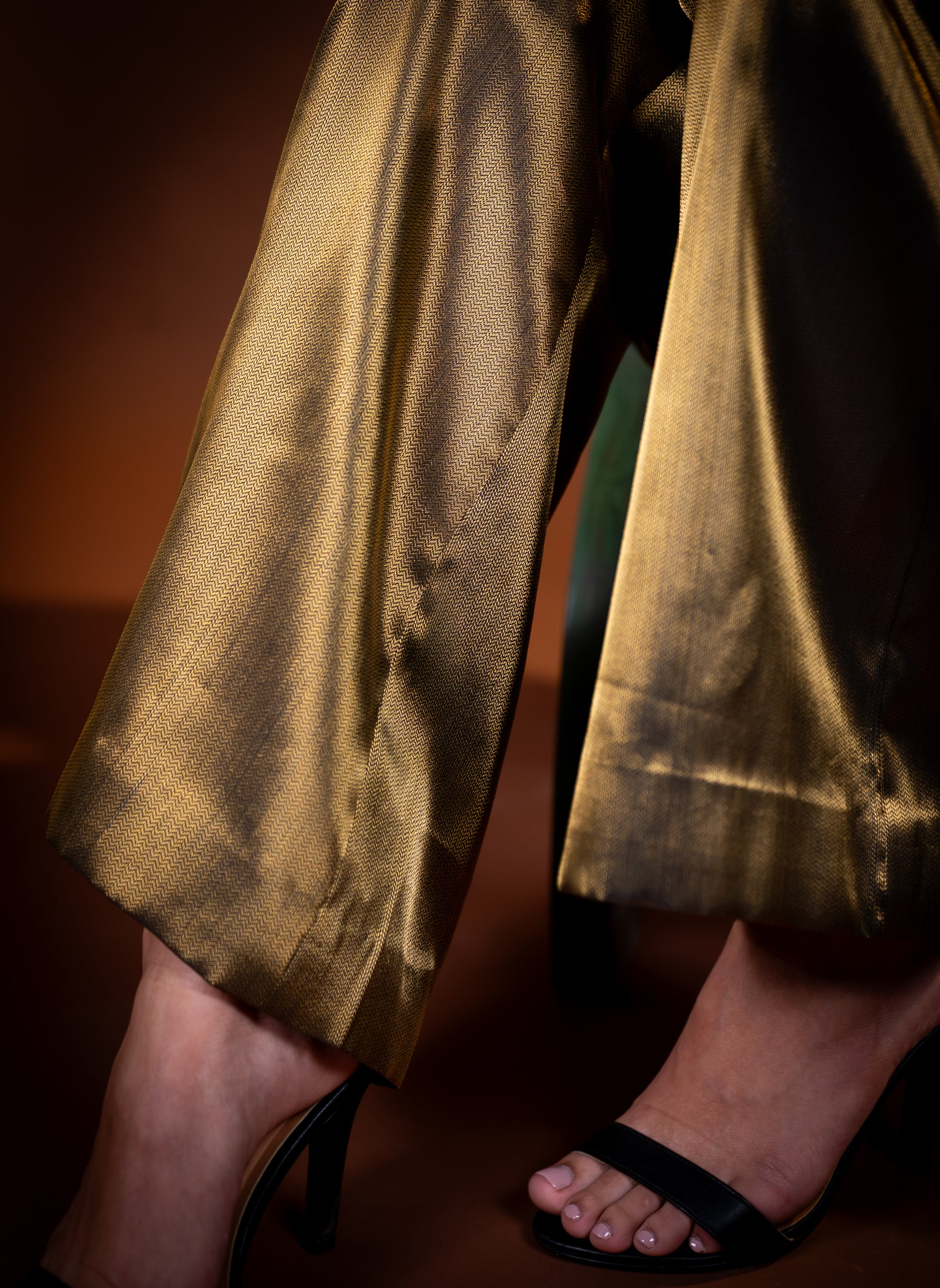 The bell-bottom trousers complete the silhouette with a smooth, balanced flare that pairs seamlessly with the structure of the top. The fabric’s natural shine and fluid movement elevate the entire ensemble, creating a look that feels bold, refined and stylish. This black gold set is a standout choice for occasions that call for elevated simplicity and timeless elegance.