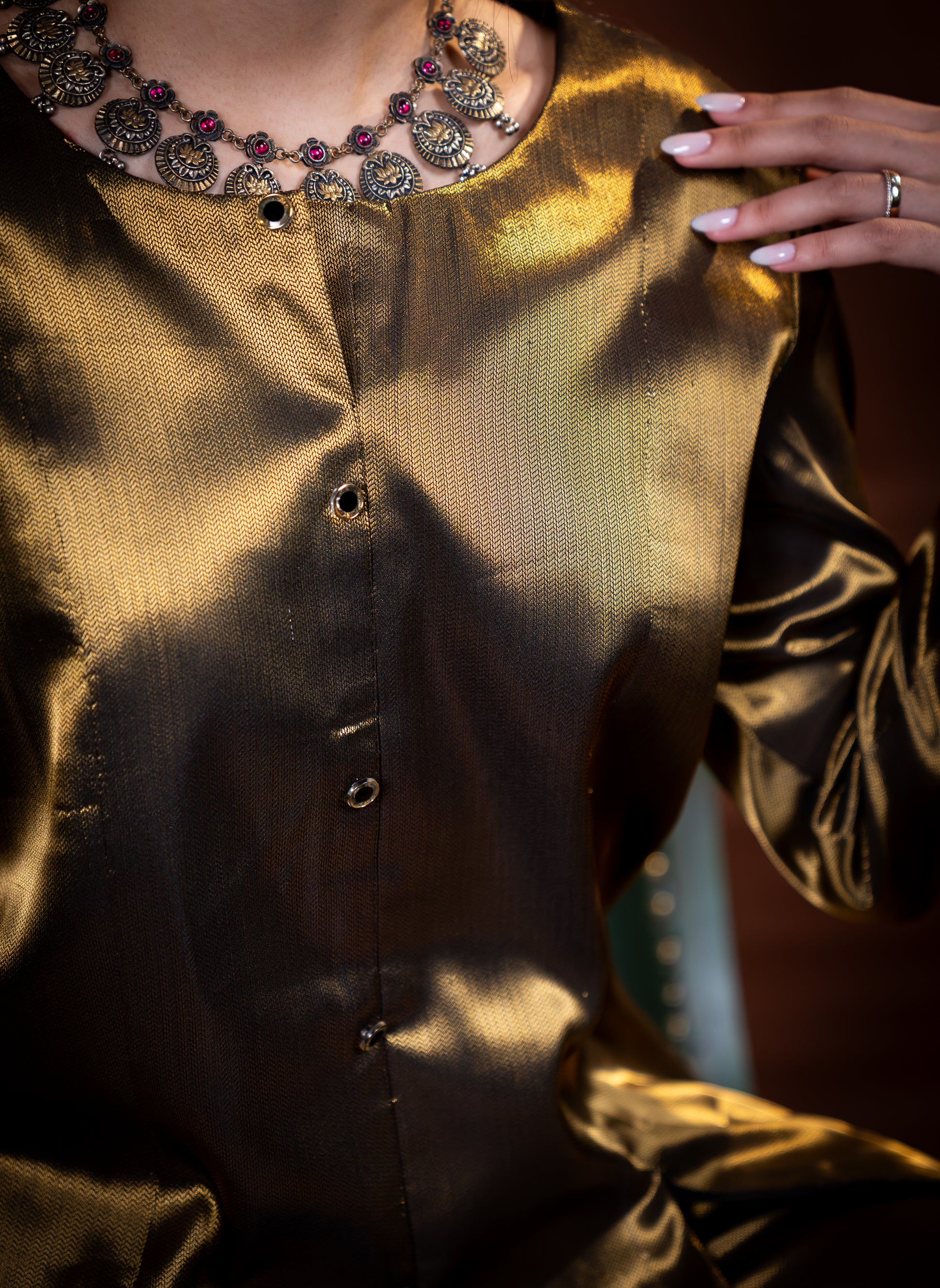 Crafted in pure tissue with a striking black-gold sheen, this co-ord set brings together sharp tailoring and understated luxury. The upper features rich, statement buttons and finely detailed edging, giving it a polished, well defined look that feels both modern and classic. The craftsmanship is clean and intentional, adding depth without any excess.